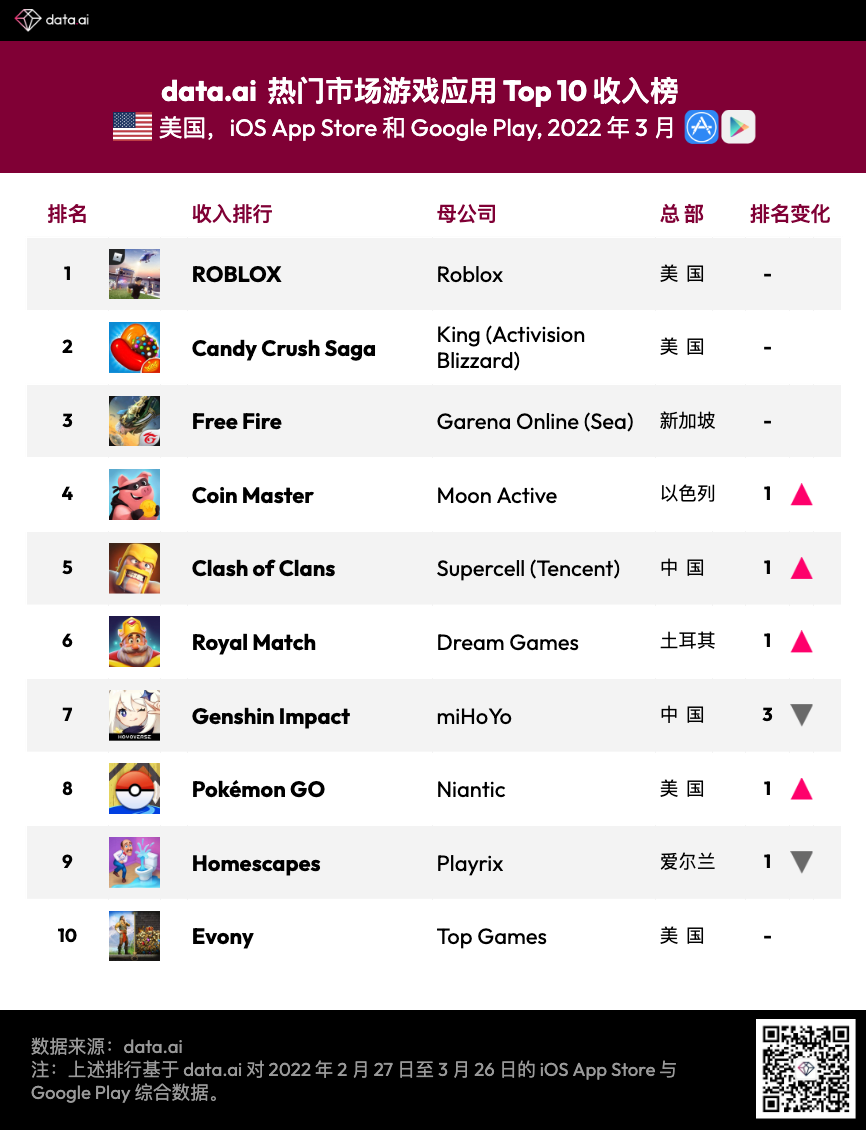 data.ai 3 月美国市场游戏下载与收入榜:玩家最爱 ROBLOX