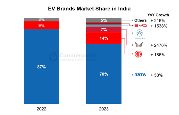 Counterpoint:印度电动汽车销量在 2023 年几乎翻番,预计 2024 年将增长 66%